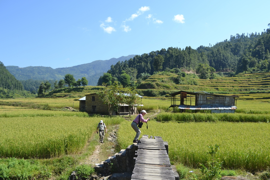Grab a window seat in your vehicle since today’s journey will take you through Nepal’s central highlands, down to the Trisuli River, and along its banks to the town of Kurintar, where traditional village dwellings line the edges of a flat, fertile expanse of farmland surrounded by forested hills. From here, take a short 30-minute stroll through the hamlet to your overnight lodging, where you’ll discover stunning views of the forest and a cold pool ready for a dip. Or, if you’re up for a little more action, make a stop in Majhimtar for an 8.5-mile (13.5-km) river rafting excursion.